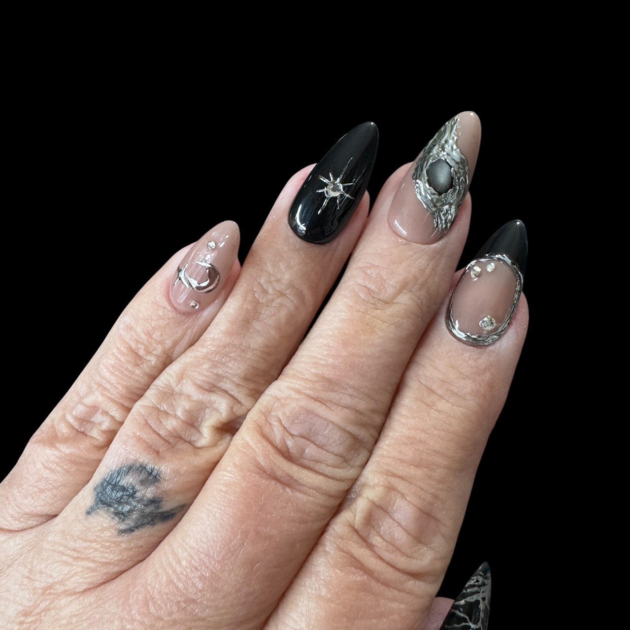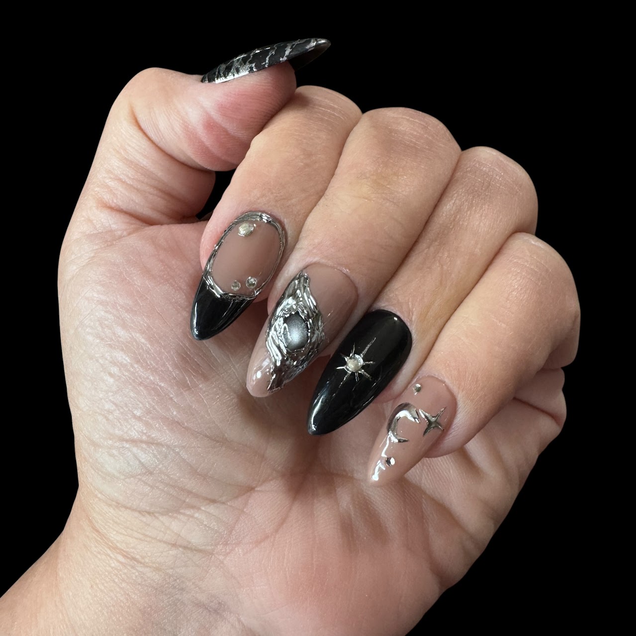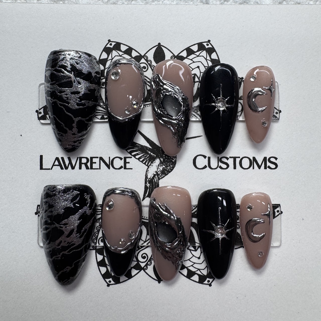 Display Images are Medium Almond CUSTOM sizing 17mm,12mm,13mm,12mm, 9mm (my nail beds are approximately 15mm in length from my cuticle to my free edge so these may seem much longer on me than on other individuals with longer nail beds) Please make sure when ordering that the shape chosen can cover your nail bed length. Collage images show the Length, Width, and inside curve of each size and style for reference. The inside curvature is the measurement i need for custom sized sets in millimeters. If Larger Thumb sizing is needed for your chosen style please feel free to message me because some styles are available in a 000 size. lawrencecustomsllc@gmail.com