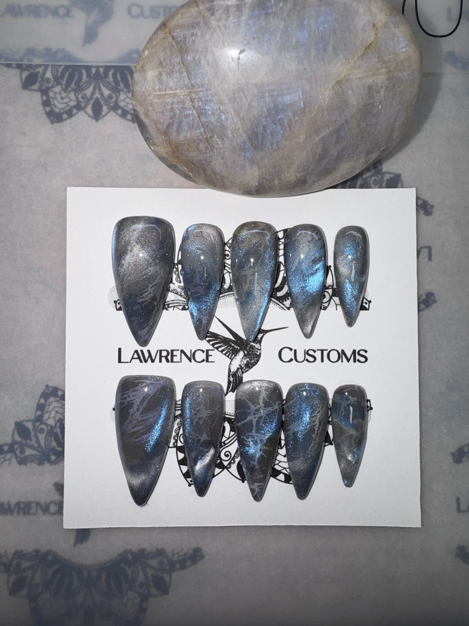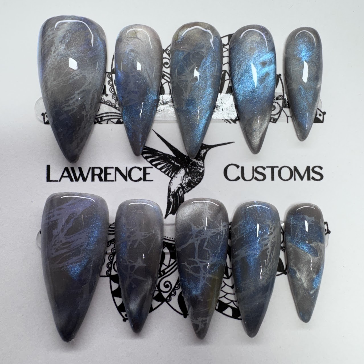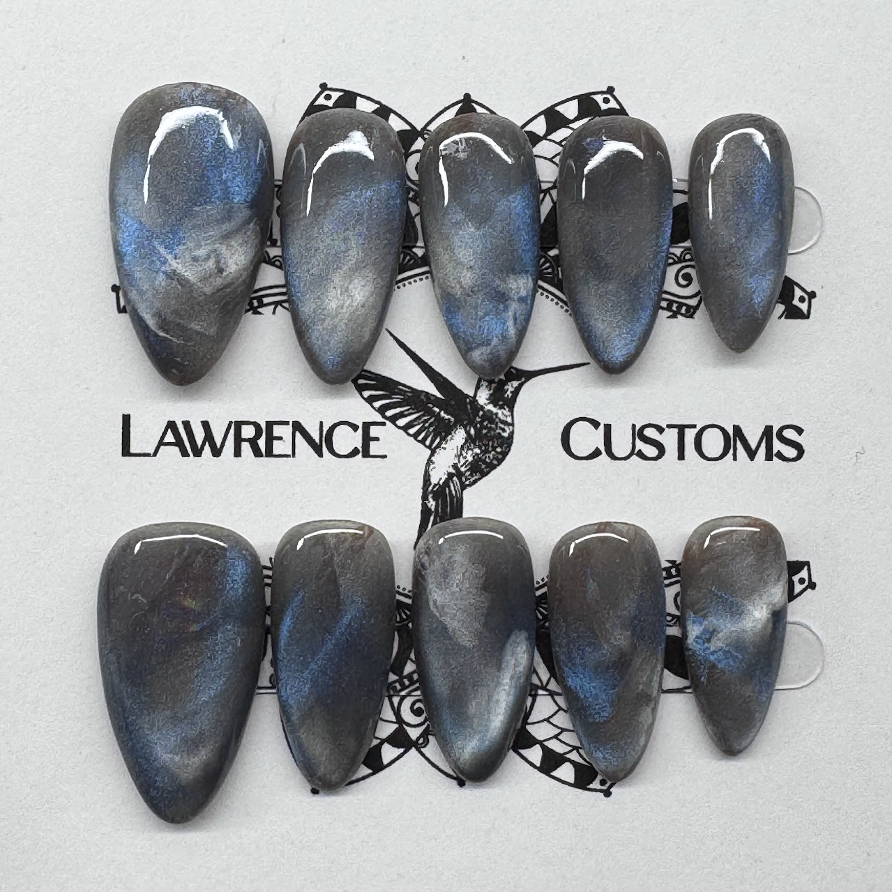 Display Images are Medium Almond and Medium Stiletto CUSTOM sizing 17mm,12mm,13mm,12mm, 9mm (my nail beds are approximately 15mm in length from my cuticle to my free edge so these may seem much longer on me than on other individuals with longer nail beds) Please make sure when ordering that the shape chosen can cover your nail bed length. Collage images show the Length, Width, and inside curve of each size and style for reference. The inside curvature is the measurement i need for custom sized sets in millimeters. If Larger Thumb sizing is needed for your chosen style please feel free to message me because some styles are available in a 000 size. lawrencecustomsllc@gmail.com